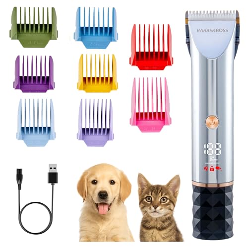 BarberBoss Cortapelos de aseo para perros, recortadora inalámbrica para mascotas con kit de uñas, peluquero silencioso para perros y gatos con 8 peines guía, pantalla LED, cortadora de cuchillas